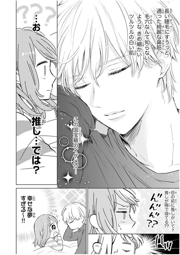 目を開けると推しが隣で寝ていた。優しく触れてもらえて話しもできるなんて、この夢、幸せすぎる…⁉/推しがとなりで寝てまして④