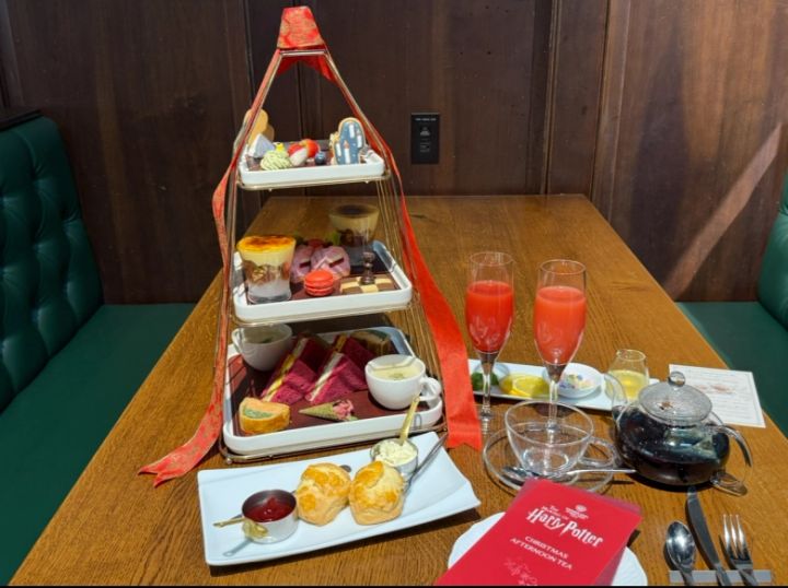 館内で楽しめるフードメニューは、どれも世界観にぴったり!『ホグワーツ・イン・ザ・スノー』期間限定のアフタヌーンティーは、三段のティースタンドにホリデーカラーのスイーツがぎゅっと並んでいます。ベリーを使ったグラスデザートやスコーン、赤いリボンがアクセントのプレートなど、細部まで“ホグワーツのクリスマス”を感じるビジュアルで、思わず写真をたくさん撮ってしまいました!