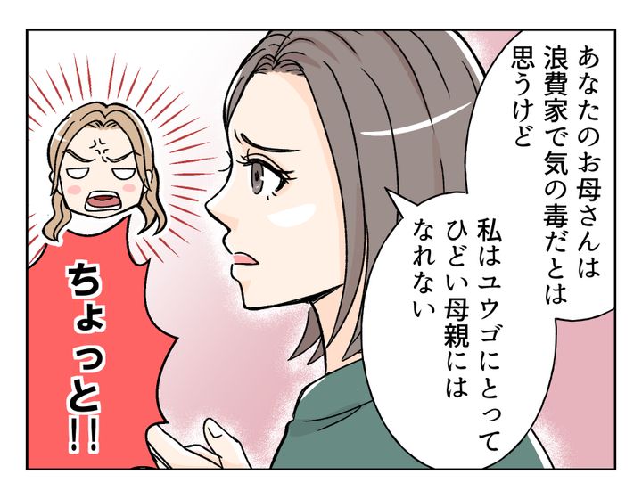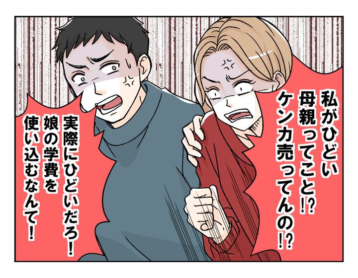 シホさんは、目の前にいるアリサさんにいっさい忖度せず、「子どものための学費をそれ以外に使うのはひどい親」と言い切りました。ここでヘンに逃げてやわらかい表現にすると、リリちゃんに自分の本意が伝わらないと思ったためです。しかしそれを聞いたアリサさん、当然のように「それ、私をディスってるでしょう!」とかみついてきました。娘の学費を浪費するなんて、どこからどう見てもひどい母親なのですから……仕方ありませんよね。