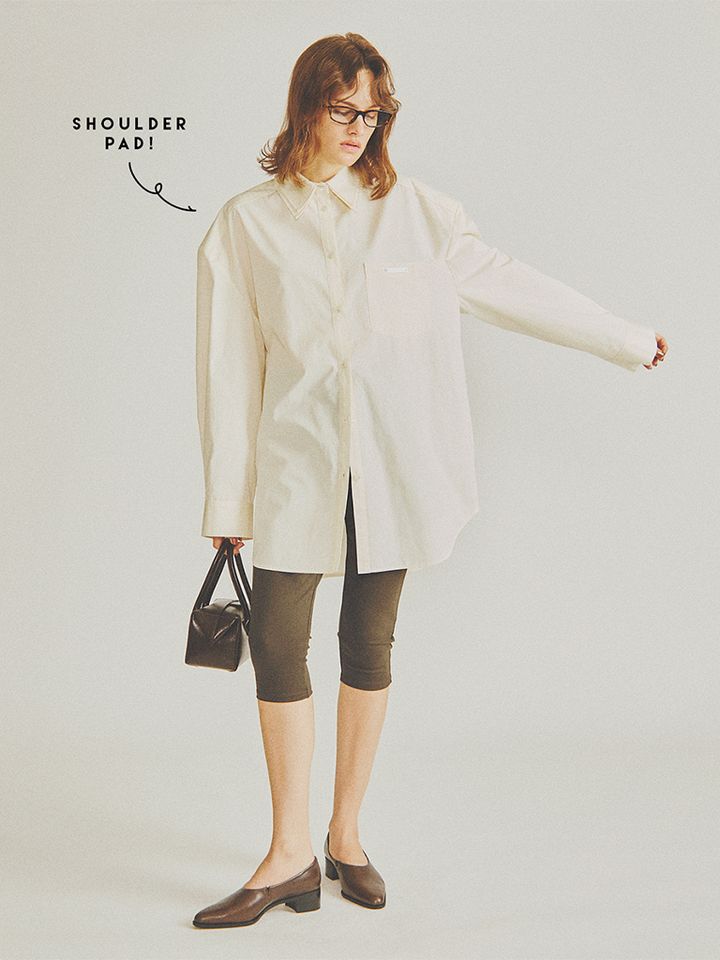 ドロップショルダーでもぼやけることなく、シャープな輪郭を残せる肩パッド。パンツというよりタイツのようなボトムでシャツとのメリハリを強調。装いに応じてパッドは取りはずし可能。
