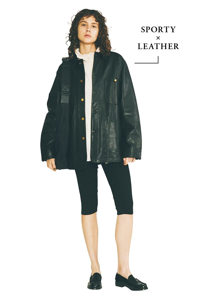 ジムにも行ける気楽なスタイルをおでかけ仕様にブラッシュアップ。レイヤードしやすいゆとりのあるオーバーサイズのおかげで、中にナイロンのブルゾンを仕込んでも膨張知らず。お尻をすっぽり隠せるロング丈と、密着感のあるレギンスのコンパクトサイズがかけ合わさって、シルエットにメリハリが生まれる。