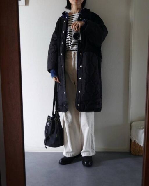 新しい家具やインテリア雑貨を探しに行く場合、朝からいくつかのショッピングモールや家具店をハシゴして気付いたら夜……なんてことも! そんな日は動きやすいよう普段着がベストです。軽やかさをプラスすべく、コートの下は白ベースでまとめましょう。