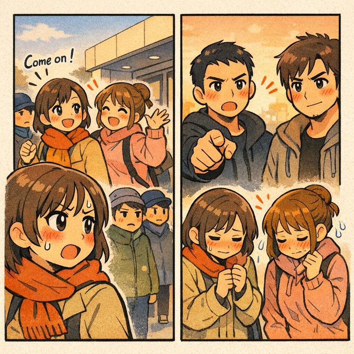 3. 「結構並んでるわね!」と言いながら、子供のお遊戯会を待つ列で横入りするママ達。だが、パパさんの正論で最後尾に並び直す結果に