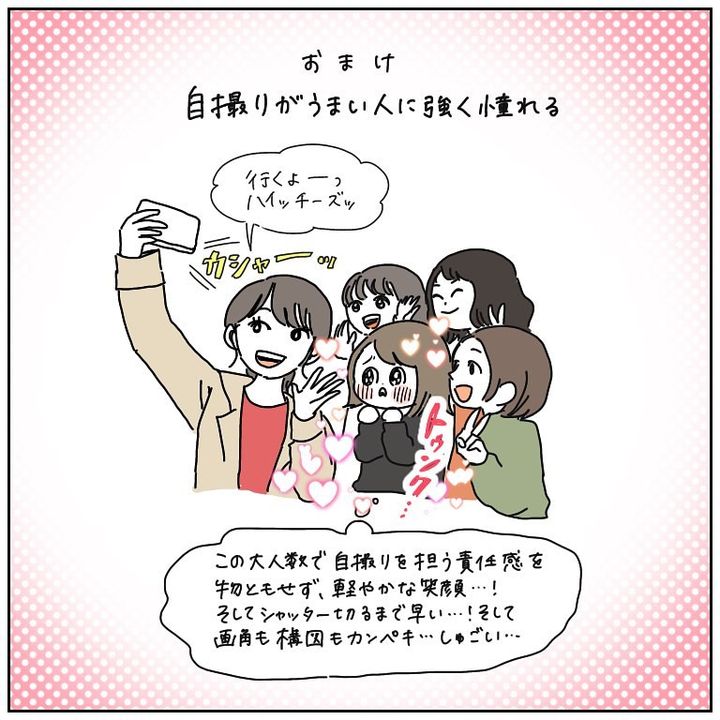 こんにちは!Instagramで日々の暮らしを漫画で紹介している、Web漫画家のmomoです。SNSにその日の出来事をアップして、記録や思い出として残してる人多いですよね。わたしももれなくその一人なんですが、唯一苦手なのが「自撮り」。友達と集まると自分が撮る側になることもあるんですが、画角や表情などがたいていメチャクチャに…。自撮り苦手勢あるある、一挙ご紹介します(汗)。