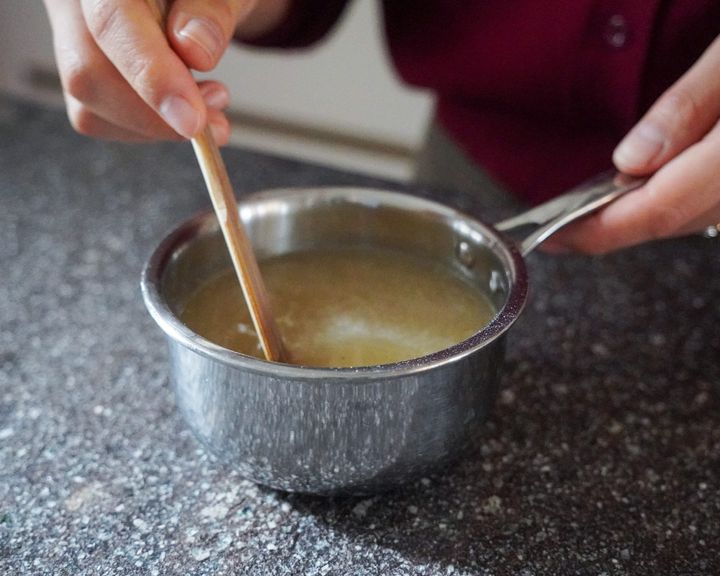 1.Aの材料を全て合わせ、小鍋に入れ火にかけ沸騰寸前(90℃)まで加熱する。(沸騰寸前の状態を2分保ち、それから火を消す。)