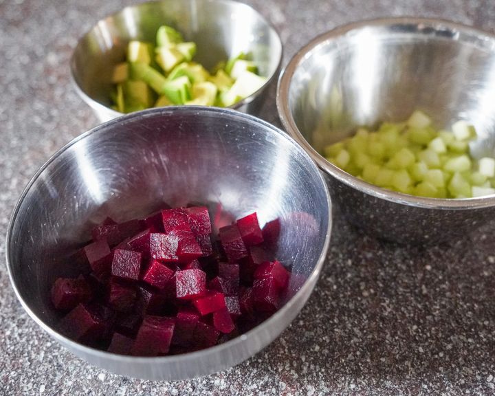 2.具材の用意をする。セロリ、アボカド、ビーツは、皮や種を取り除き、それぞれ5mm程の大きさに切る。