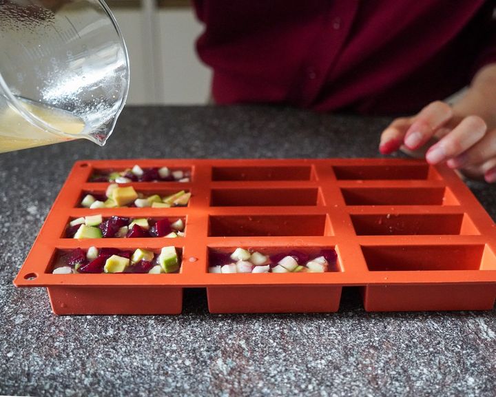 3.型に2の具材をバランス良く敷き詰め、1の液を隙間まで行き渡るように流し込み、冷蔵庫で冷やす。