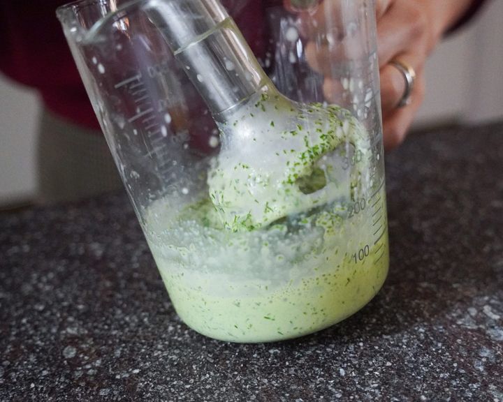 4.ディルソースの用意をする。材料を全て合わせ、高速ミキサーやハンドブレンダーで撹拌する。