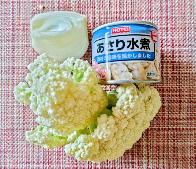 カリフラワー…150g 玉ねぎ…50g あさりの水煮…1缶(内容量125g) すりおろし生姜…小さじ1/4 塩…ひとつまみ コンソメ顆粒…小さじ1/2 牛乳…200ml バター…10g