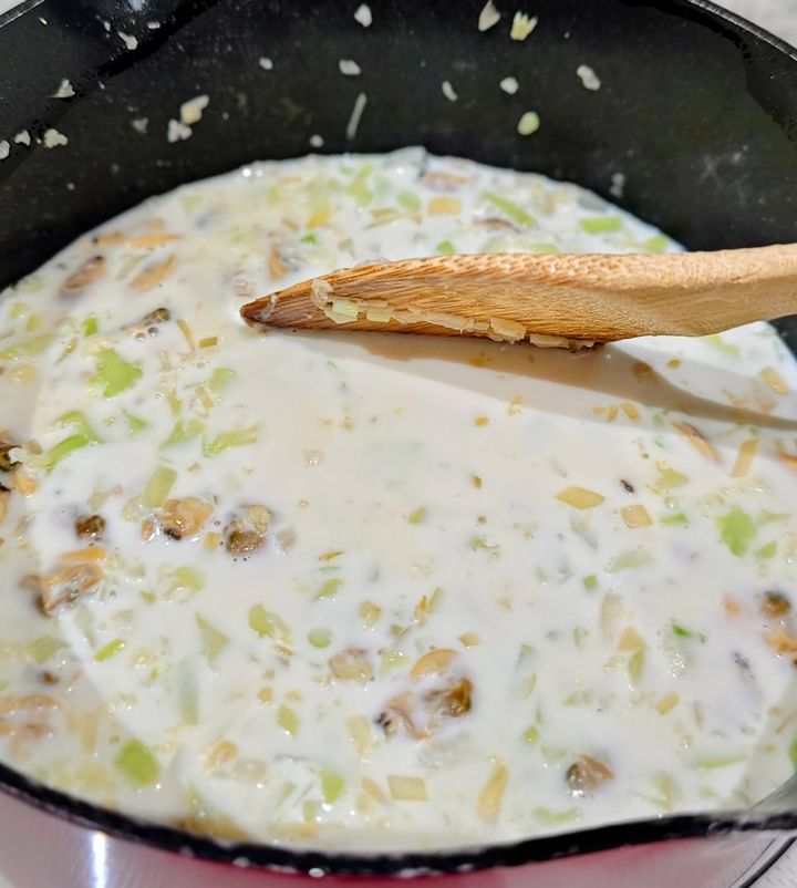 【3】あさりの水煮缶を汁ごと加え、コンソメ顆粒も加えて混ぜる。 牛乳を加えたら、中火で沸騰させないように温める。 ふつふつしてきたら、ごく弱火で1分加熱する。