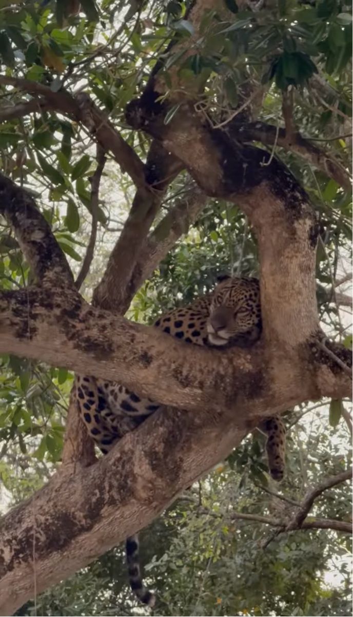 葉が生い茂る大きな木を見上げると、そこにはジャガーの姿が! 幹と枝をベッド代わりにして、のんびり横になって休んでいました。