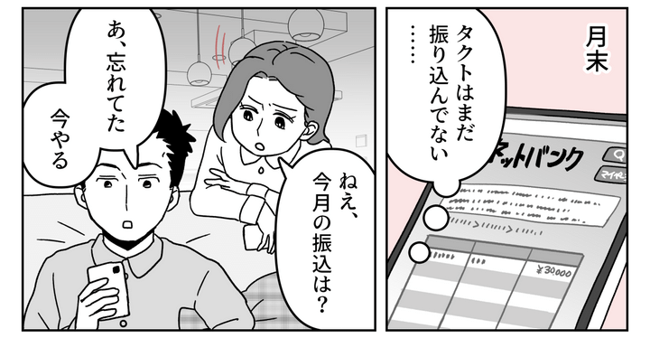 私(ナナ、30代)は3歳の娘(アミ)の母。私の両親は、娘のためにお金を積み立ててくれています。しかし夫(タクト、30代)がそのお金を勝手に使い込んだうえ、悪びれもせずに借りただけと言うのです。そして私から離婚という言葉を聞いた義母は「お金は返すから、この話はなかったことに。こんなことで離婚を言い出すなんて」と私を悪者のように言ってきました。後日、私は夫の反省と改心する覚悟を見せてもらうため、夫に毎月3万を新しく開設した口座に振り込むように伝えました。