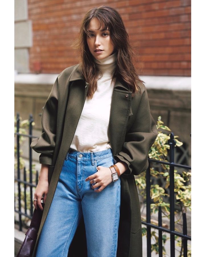 ウォッチ『ケープコッド』〈SS、シルバーオパーリン文字盤、ヴォー・バレニア〉¥523,600リング[右手]¥191,400[左手]¥172,700(すべてエルメス/エルメスジャポン)コート¥88,000(アダム エロペ)タートルニット¥34,100(スローン/ザ ショップ スローン 新静岡セノバ店)デニムパンツ¥28,600(SERGE/ショールーム セッション)バッグ/スタイリスト私物