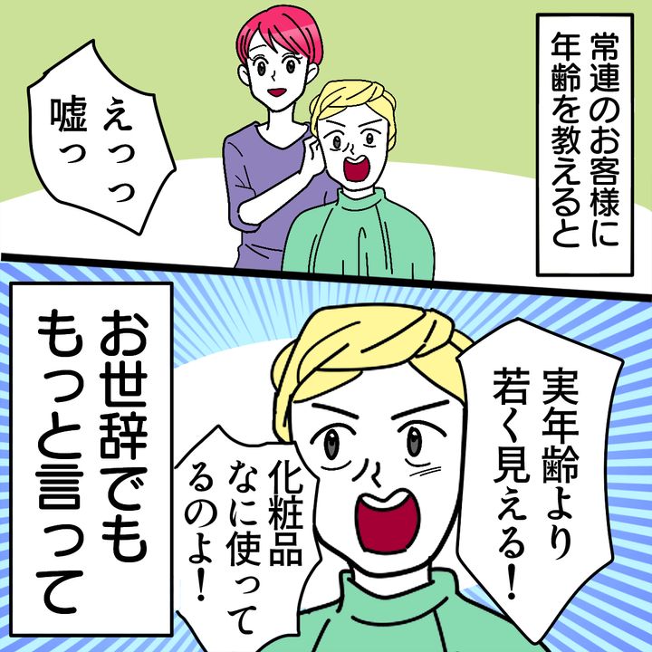 美容院でお客様を接客中の投稿者さん。気心知れた常連のお客さんとの会話のなかで、なにげなく自分の年齢を伝えることに。そこでかけられたとっても嬉しい言葉を紹介してくれました。その言葉がこちら!