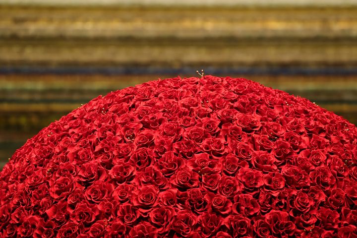 約1,000本の赤いバラのプリザーブドフラワーを使うのは毎年の恒例ですが、その年ごとに少しずつアレンジが変化していることをご存じでしょうか。今年は、ゴールドのビジューが135個ちりばめられ、遠目にも上品にきらめいています。