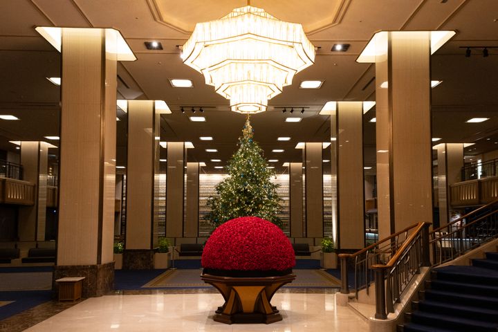 【帝国ホテル 東京】135個のビジューを飾った深紅のロビー装花と5メートルのツリー、日比谷の街を照らすイルミネーションも
