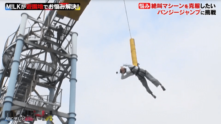 最後のアトラクションは、22メートルの高さから飛び降りるバンジージャンプ。「全然余裕やんな!」「全然怖ないやん!」と、最初こそ余裕だったサポート役の塩﨑は、途中で「ごめん! かっこつけていたけど全然怖い!」とひるんだが、依頼人を勇気づけるために飛んだ!