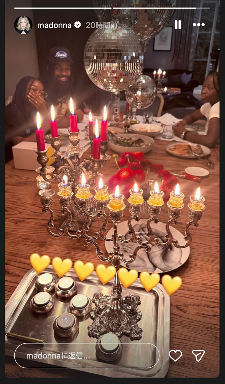 2枚目の写真にはハヌカのためのディナーテーブルの様子が写っている。現在交際中の恋人アキーム・モリスと、マドンナの養子で13歳の双子、ステラとエステルがカメラに笑顔を見せている。9本のキャンドルを立てられる燭台には8本のキャンドルが。マドンナには6人の子ども、実子のローデスとロッコ、養子のデヴィッド・バンダとマーシー、そして双子がいる。マドンナ本人とアキームを加えた8人でハヌカを祝うため、その人数に合わせてキャンドルを準備したのではないかと見られている。マドンナはゲストの数を表したのか、7つのハートを写真に添えている。