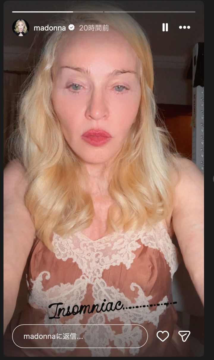 週末にインスタグラムのストーリーを更新したマドンナ。ランジェリー姿のセルフィーを投稿、「不眠症」とコメントした。唇は赤みを帯びているものの、いつもに比べて目力は圧倒的に弱め。ほぼすっぴんと見られている。