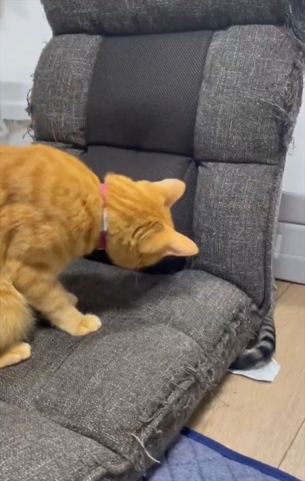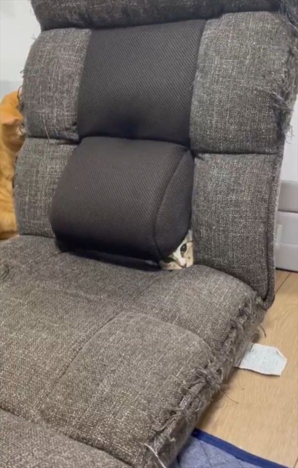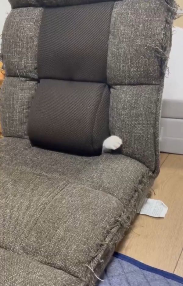 家の中で新しい遊び場を見つけたネコ。 座椅子の隙間からおててやお顔を出している様子が反響を呼んでいます!