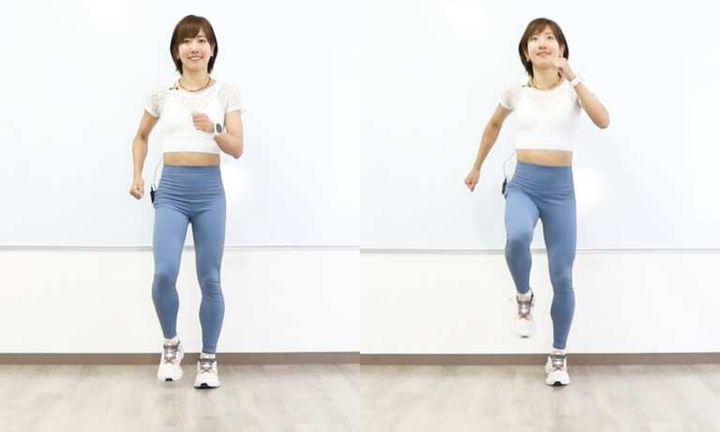 背筋を伸ばし、腕を自然に振ることで全身の筋肉が連動しやすくなります。太ももを床と平行になるくらいまでしっかり上げ、一定のリズムを保つことで有酸素運動としての効果を安定させましょう。