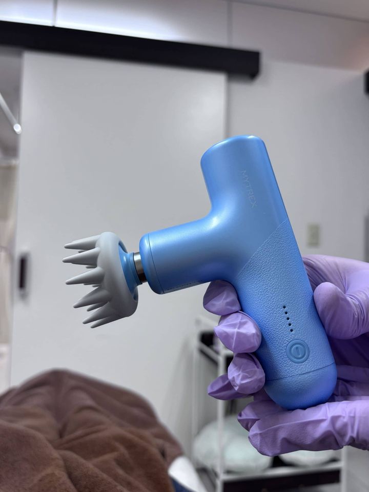 施術前に麻酔クリームを塗って20分置き、痛み軽減。さらにこちらのクリニックでは、マッサージガンを鎖骨に当てながら痛み逃しまでしてくださいました。(鎖骨に置くのが1番痛くないと検証したんです、と体を張って検証済みの、患者思いな看護師・菊谷さん)