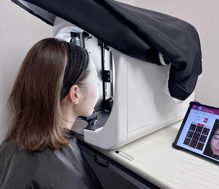 洗顔をして肌診断へ。re-Beau(レビュー)という肌画像解析機器で、目に見えないメラニンやポルフィリンを可視化します。その後、看護責任者の菊谷さんから改めてソフウェーブの説明をしていただきました。