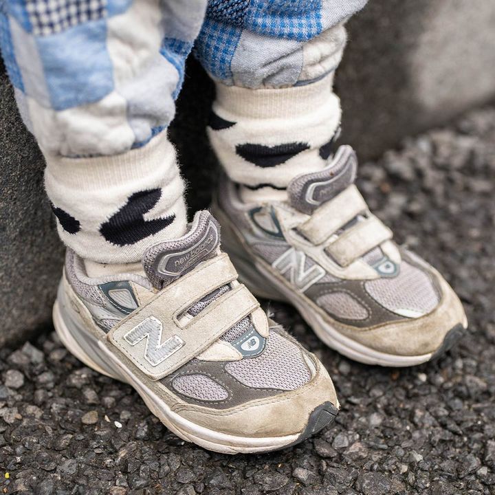 パッチワークパンツにハートのソックスとキュートなスタイリング。足元はグレーのスニーカーでトーンを合わせてまとまりよく。
