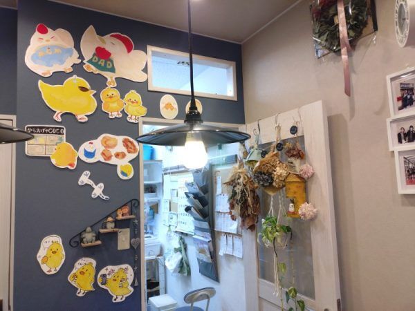 からあげやCOCOさんの店内は、とってもにぎやか。近くの学校の学生さんが書いてくださったニワトリの絵の数々を筆頭に、たくさんの名刺やチラシ。花屋さんやコーヒー屋さん、パン屋さんとのコラボ企画など、楽しいイベントも開催されています。