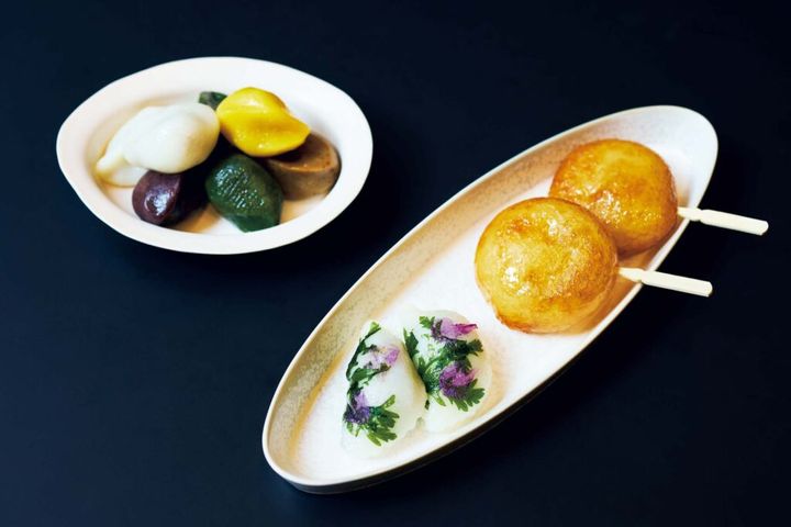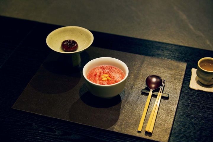 岩に生える食用キノコ、石耳(ソギ)を使った餅菓子は、節気に合わせた食材を使った伝統菓子を提供する、秋のコース(80,000W)から。