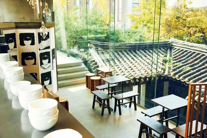 夏の名物、パッピンス(かき氷)のイラストが描かれた屏風や、白磁や青磁の器がディスプレイされている店内。
