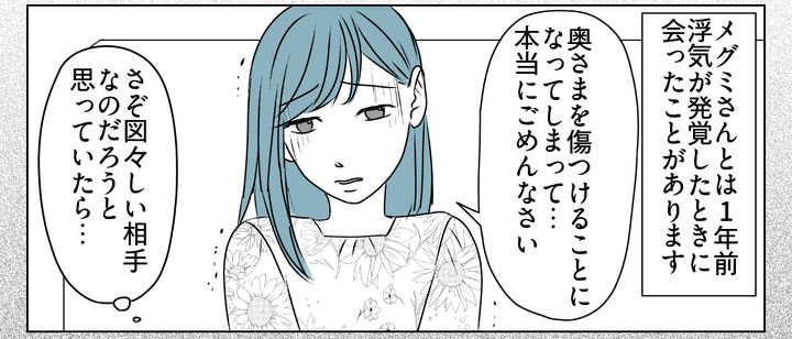 私は夫の浮気相手のメグミさんの顔を思い浮かべました。1年前浮気が発覚したときに、3人で会ったことがあるのです。