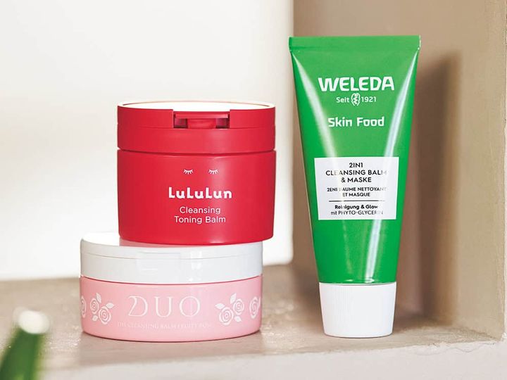 左下から、デュオ ザ クレンジングバーム フルーティーローズの香り 90g ¥3,960【数量限定】(DUO)、ルルルンクレンジング トーニングバーム SMOOTH RED 90g ¥2,420(Dr.ルルルン)、スキンフード クレンジングバーム 75㎖ ¥3,630(ヴェレダ)