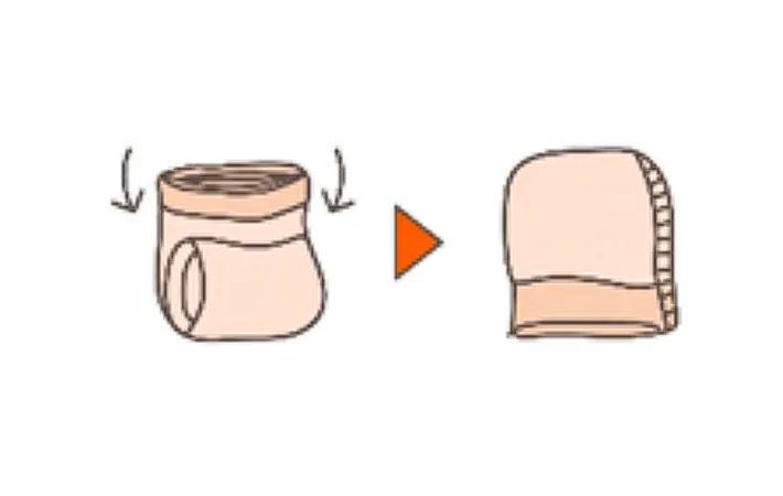 ウエストテープ部を裏返して全体を包み、コンパクトに整えて…。
