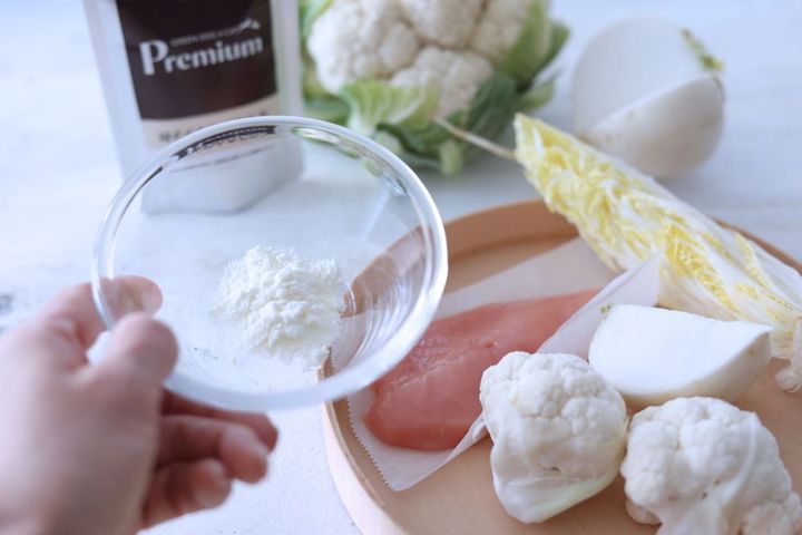 ヤギミルクパウダーを使って、野菜と鶏肉のシチューを作ります。