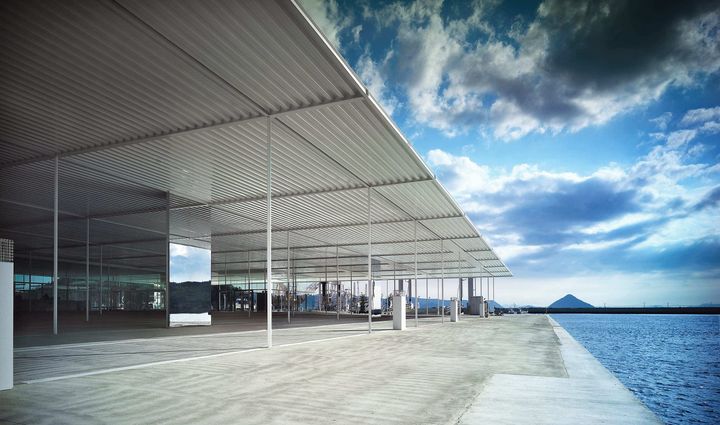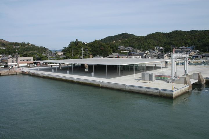 瀬戸内海に浮かぶアートの島、直島。その玄関口である宮浦港に佇む海の駅「なおしま」は、妹島和世と西沢立衛からなる建築家ユニットSANAAの設計によって2006年に完成した。薄い鉄板の大屋根を複数の細いポールで支えた軽やかで開放感あふれる平屋建てで、外壁は外と中の境界を曖昧にするガラス張りに。耐震壁としての役目を果たしている鏡には、美しい島の風景が映し出されている。