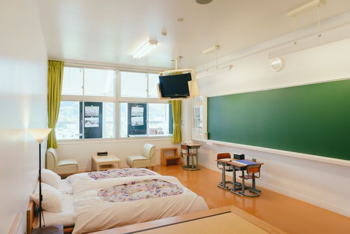 地元の食材を用いた給食メニューを楽しめるだけでなく、「小学校に泊まる」というノスタルジックな体験もここではできる。黒板やロッカー、机と椅子など、なつかしい教室の面影を残した2〜4名用の個室、5〜15名に対応する団体合宿用の大部屋のほか、大浴場「里の小湯」も完備。大浴場は、日帰り入浴も可能だ。