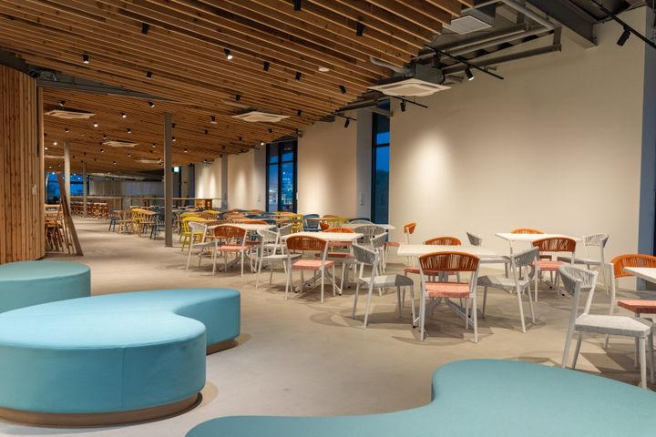 茨城県は、鹿児島県に次ぐさつまいもの一大産地。イベント広場では、大きな芋のオブジェがお出迎えしてくれる。「食のテーマパーク」をコンセプトに掲げた施設は2階建で、1階では地域の情報を提供する施設に加え、物販施設や飲食施設が充実。内部に進むと、開放的な空間が広がり、歩行者の動線が自由に確保されている点も魅力的だ。