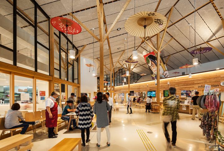 N.A.S.A.設計共同体(NASCA+設計組織ADH+architecture WORKSHOP+空間研究所)が設計した「道の駅 保田小学校」は、廃校をリノベーションした個性派の道の駅。校舎だった空間は既存の間取りを活かしつつ、職員室は「cafe金次郎」、教室は「中国料理3年B組」など、ユニークな名前をもつ多彩なジャンルの飲食店へと転用。120年以上続いた歴史ある小学校の面影を残しながらも、まちの活性化につながる新たな建築的工夫を加えている。