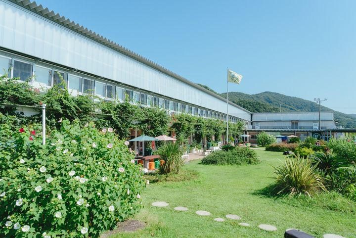 広さ800㎡の旧体育館を活用した「里山市場 きょなん楽市」も見どころのひとつ。老朽化が進んでいた体育館は、屋根と鉄骨を活かしながら耐震補強を施し、小学校時代の備品や校庭の樹木も家具として再利用。さらに、温室を思わせる半透明のポリカーボネートを外壁に採用し、周囲の農村風景に溶け込む工夫がなされている。リノベーションの大きな可能性を感じさせる建築デザインは一見の価値ありだ。