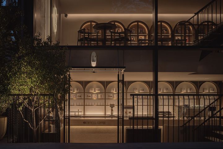 地上3フロアはカフェとして構成されており、各フロアは開放的な吹き抜けで繋がっている。1階にはコーヒーカウンターと焙煎室、中庭に面した客席を設置。2階にも席を設け、3階は予約制のバー兼スペシャルラウンジとなっている。