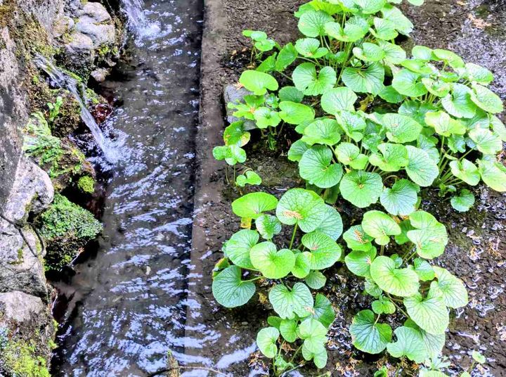 茶畑に隣接する世界農業遺産「わさび田」も見学できます。ビニールハウスで育てた苗を水辺に植え替えて良質なわさびが育ちます。一定の温度を保った安倍川の湧水が大量に流れることに加えて、高度な栽培技術も必要なのだそう。