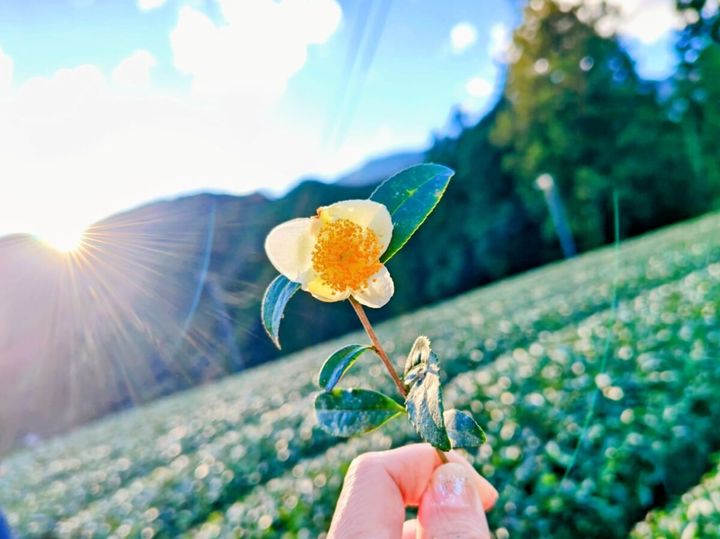 春の新緑から落ち着いた色合いとなった秋の茶畑には、白い“茶の花”がちょこんちょこんと咲いていて、なんだか微笑ましい気持ちに。