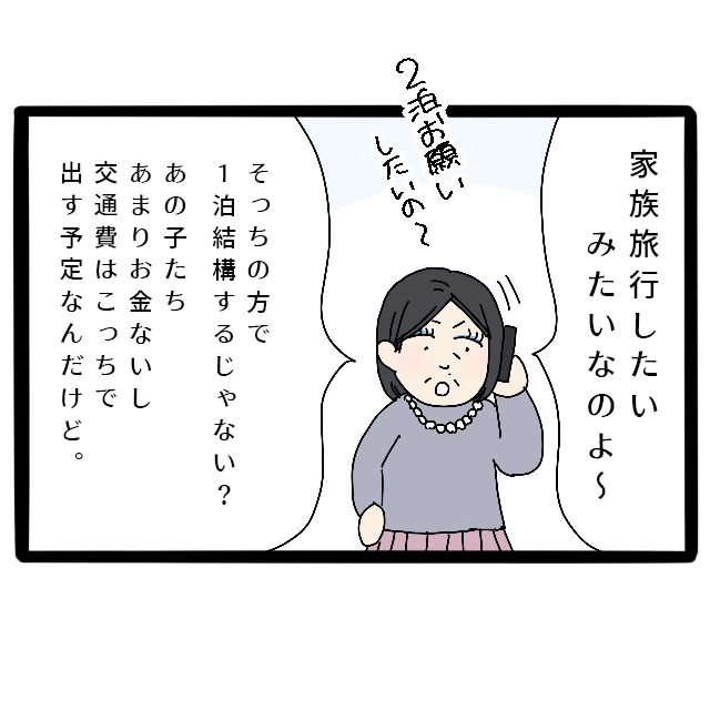 義母によると、信也君は私たちが住んでいる地域の方へ家族旅行したいものの、1泊の宿泊代が割と高いので、我が家へ2泊したいそうなのです。驚くことに交通費は義母が出すといいます。