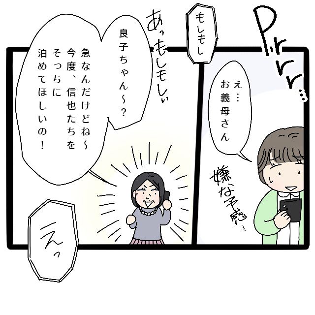 夫達也の弟信也君たち家族を泊めてほしいというお義母さんの言葉に、予感は的中したと思いました。結婚して子供もいる信也君のことを未だに甘やかしているお義母さん。言葉の調子から断れる感じではなさそうだなと憂鬱になりました。