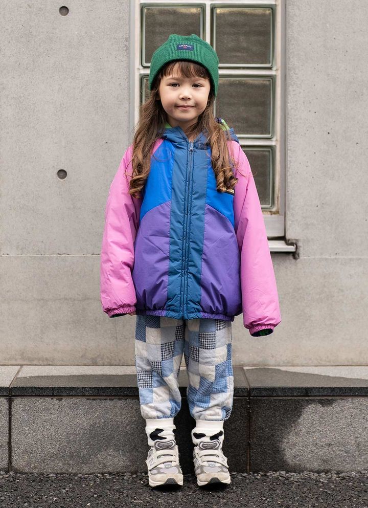 OUTER:ボボショーズピンク、ブルー、パープルのマルチなカラーブロックが可愛らしい『ボボショーズ』のアウターで、街行く人の視線を独り占めするデイジーちゃん。パッチワーク風のキルティングパンツを合わせて、冬でもぽかぽかな着こなしに♡ 仕上げに『ノア』のビーニーをプラスして、遊び心のある色合わせが完成!item▼