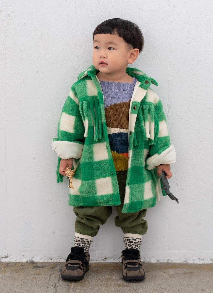 OUTER:メイドフォーミニアーティな柄のニットにモスグリーンのパンツを合わせたダンくん。主役にしたのは、レトロなグリーン×ホワイトチェックのアウター。厚手素材のほっこり可愛いムードが魅力。さらに袖や胸元にあしらわれたフリンジが動くたびに存在感を放つナイスなアクセントに! 足元にレオパード柄の靴下をプラスすれば遊び心も。item▼