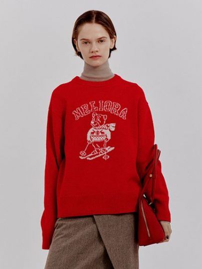 スキーをするクマモチーフがキュート♡ 素朴で味のあるジャガードで表現され、マフラーの部分は立体的になっているなど、凝った編み模様が魅力です。冬スタイルのスパイスとして、コートのインに重ねたり、シンプルなボトムやミニスカートと合わせるなど、デイリーで気軽に楽しめる暖かい一枚です。