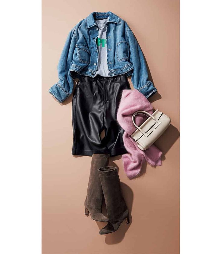 ジャケット¥201,300(プラン シー/ブルーベル・ジャパン)Tシャツ¥14,300(カデュネ)ハーフパンツ¥53,900(styling/)バッグ¥44,000(アナイ)ブーツ¥110,000(ネブローニ)ストール¥35,200(ドレスレイブ/ジオン商事)