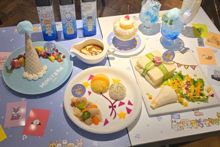 水色と白を基調とした机には、一列に並んだMINITEENが♡ カフェメニューと一緒に撮ったら可愛い写真が撮れること間違いなし!